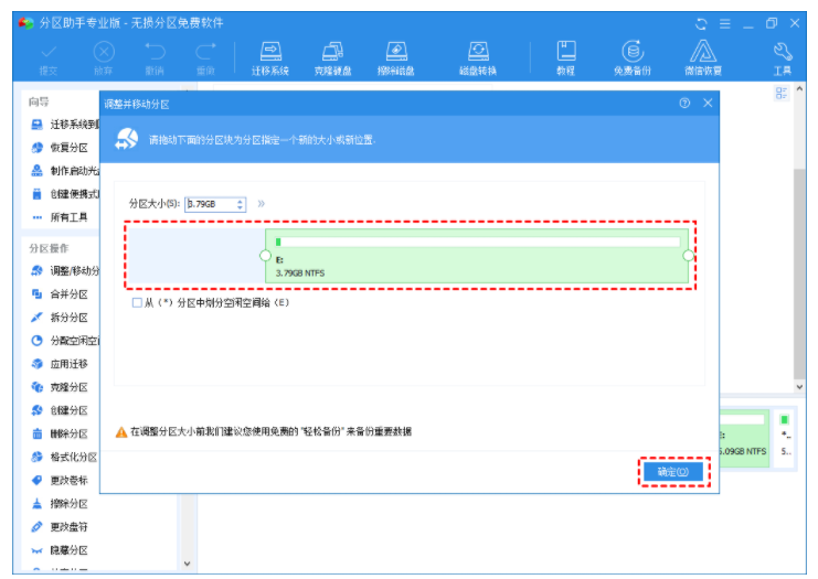 2. 通過(guò)拖動(dòng)左側(cè)圓形按鈕來(lái)縮小E分區(qū)大小,并點(diǎn)擊“確定”按鈕。