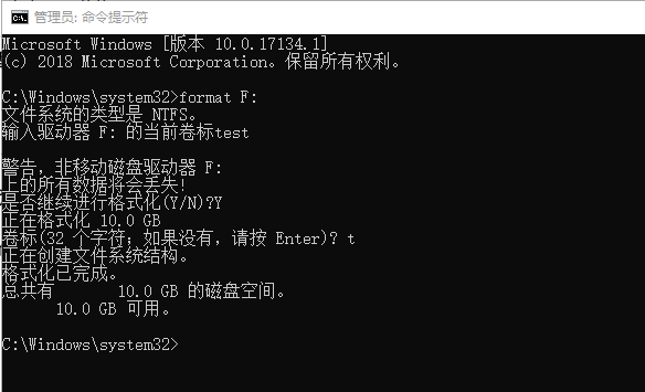 1、通過命令格式化:以管理員身份打開命令提示符,輸入format F:(F是需要格式化的分區(qū)),回車,根據(jù)提示操作,耐心等待一會(huì)兒,就可以看到格式化完成啦。