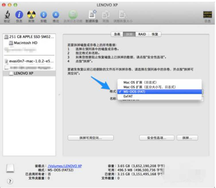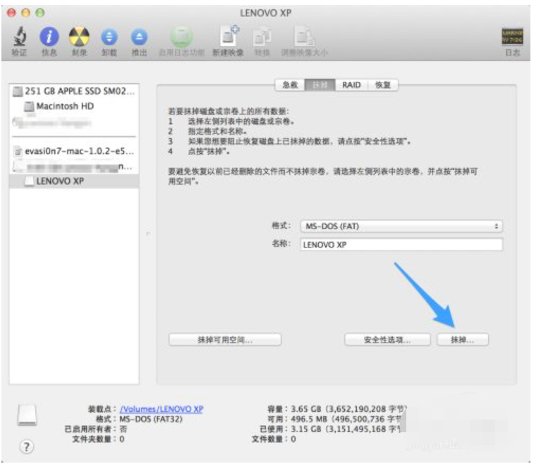 2、選擇要格式化U盤的格式,點(diǎn)擊窗口中的“抹掉”按鈕,完成。