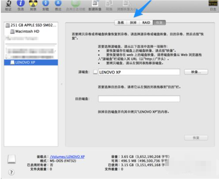 2、在左側(cè)欄里選中想要格式化的 U 盤,再點(diǎn)擊右欄中的“抹掉”選項(xiàng)卡,如圖所示
