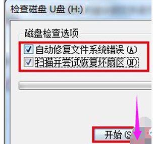 3.勾選所有選項,然后點擊開始,耐心等候進行U盤的修復工作。
