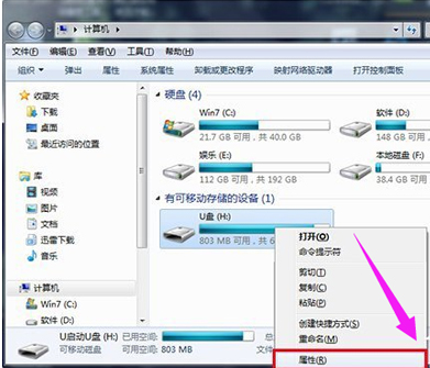 1.將u盤插到電腦usb接口中,鼠標右鍵u盤點擊屬性。
