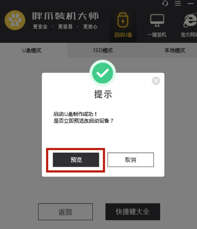 5.U盤pe安裝完成以后,軟件會自動跳出相應(yīng)的提示,用戶可以直接點擊“預(yù)覽”查看u盤pe是否制作成功。如果出現(xiàn)下面圖片,則說明安裝成功。之前沒有選擇在胖爪裝機(jī)大師中下載系統(tǒng)的小伙伴們需要將之前下載好的系統(tǒng)文件復(fù)制到U盤當(dāng)中。(其他網(wǎng)站的系統(tǒng)鏡像文件一樣適用)