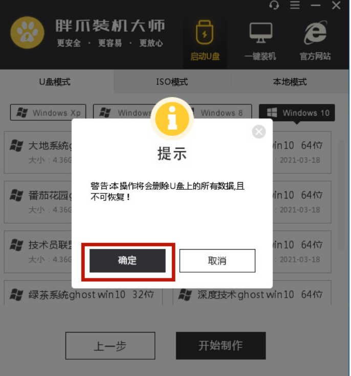3.在這一步環(huán)節(jié)中如果小伙伴們手頭沒有可用的系統(tǒng)鏡像文件。可以直接選擇胖爪裝機(jī)大師中自帶的系統(tǒng)。如果已經(jīng)有相關(guān)的系統(tǒng)文件,則不要點擊任何選項,直接點擊“開始制作”,然后在警告頁面點擊“確定”;、