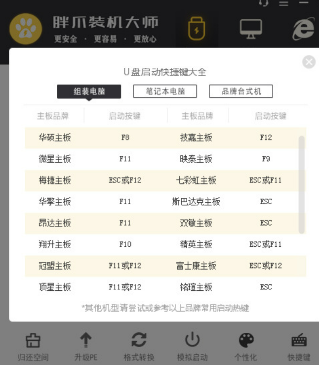 6.在U盤pe安裝成功以后,我們還需要知道電腦的bios啟動界面,用戶可以直接點擊“快捷鍵”來查看自己電腦對應(yīng)的bios按鈕;
