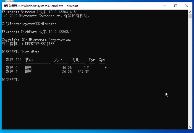 5、這里輸入并回車執(zhí)行 select disk 1 命令,也就是選擇當(dāng)前30GB大小的U盤。