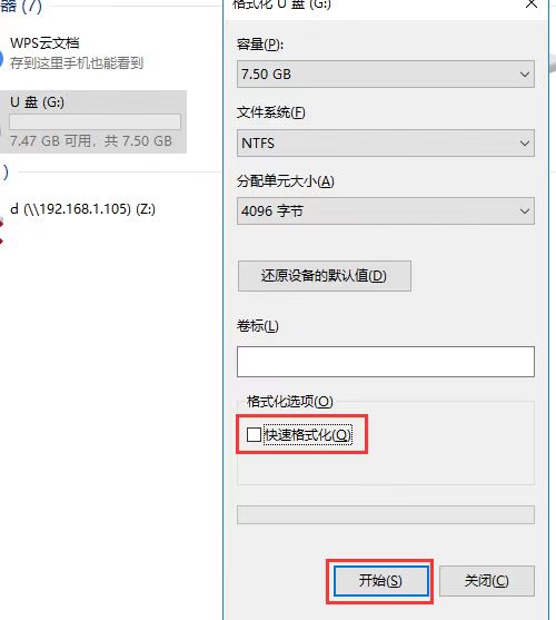 2、在彈出的窗口中取消勾選快速格式化,然后點(diǎn)擊開(kāi)始即可,待格式化完成即可。