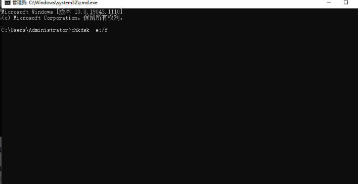 2. 進(jìn)入管理員頁(yè)面后,選擇執(zhí)行chkdsk命令,chkdsk e: /f 中的e為U盤(pán)的磁盤(pán)區(qū)符號(hào),f就是修復(fù)的命令名稱。