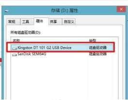 2. 在“屬性”中點(diǎn)擊“硬件”,選擇“Kingston DT 101 G2 USB Devic 磁盤驅(qū)動器”中設(shè)備屬性。