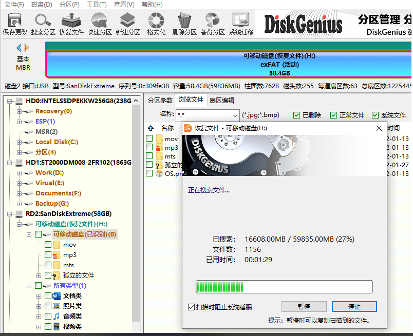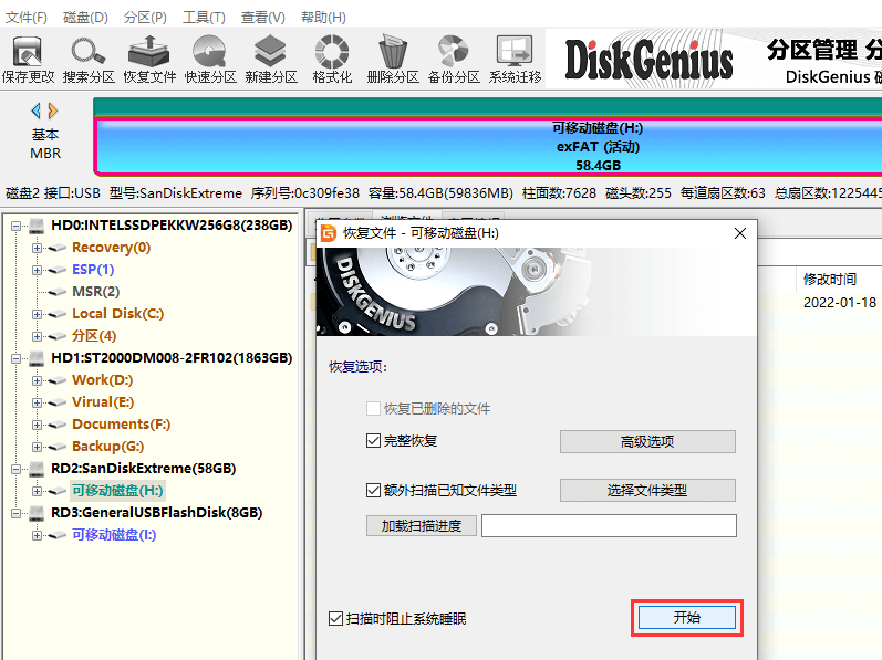 3、選擇恢復模式,然后點擊“開始”按鈕,軟件開始對丟失數(shù)據(jù)的分區(qū)進行完整深度的掃描。