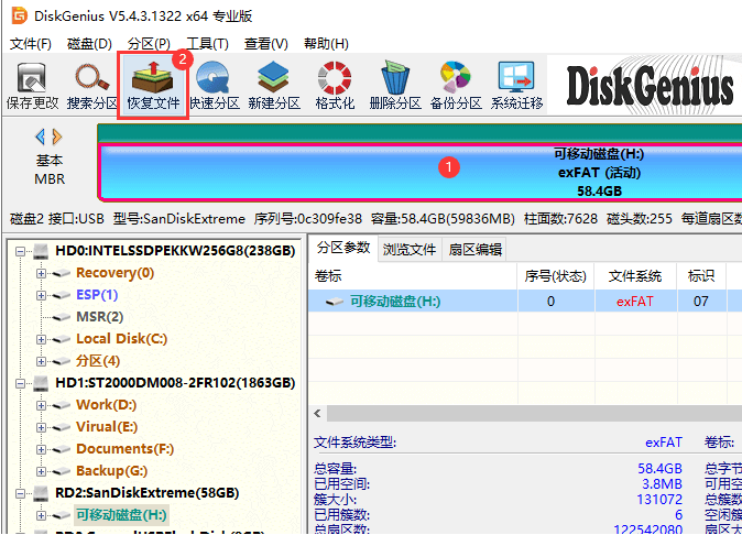 2、選擇需要恢復數(shù)據(jù)的U盤,并點擊左上方的“恢復文件”按鈕。