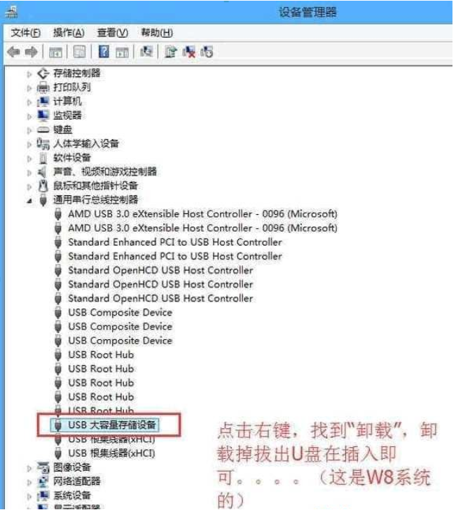 4、如果沒有黃色感嘆號,那我們也可以嘗試鼠標右鍵點擊USB大容量存儲設備,然后點擊卸載,再把U盤重新拔插一次即可顯示。
