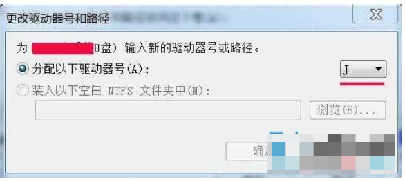 4、然后點分配以下驅動號后面的框,選擇一個電腦其他硬盤或者磁盤沒有被使用過的盤符,比如J盤,然后點確定。