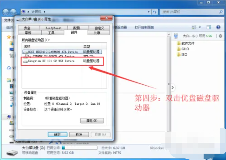 4、進(jìn)入“硬件”面板以后。在驅(qū)動(dòng)器列表中找到U盤的磁盤驅(qū)動(dòng)器然后雙擊它。