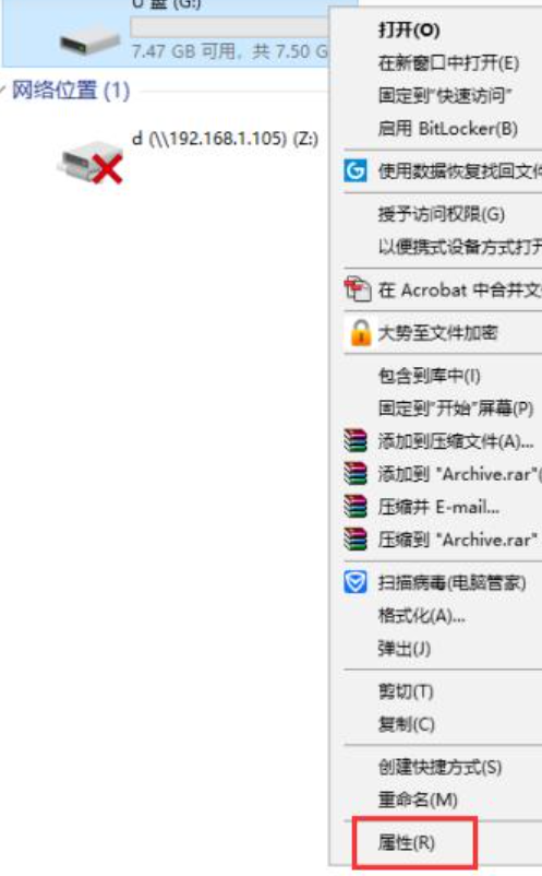 1、在U盤盤符的上方點(diǎn)擊右鍵,在彈出的菜單中點(diǎn)擊屬性。