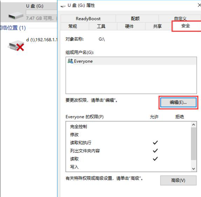 3、在打開的窗口上部選中everyone,然后在下方everyone的權(quán)限中勾選完全控制,最后依次點(diǎn)擊確定即可。然后我們就可以對U盤進(jìn)行格式化了。