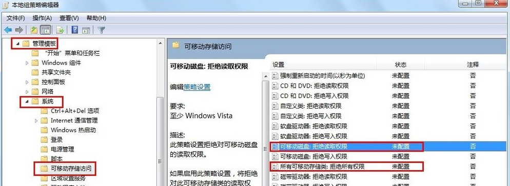 5、在組策略管事器窗口中,依次點擊“管理模塊”→“系統(tǒng)”→“可移動存儲訪問”,確保右側(cè)“可移動磁盤:拒絕讀取權(quán)限”和“所有可移動磁盤:拒絕讀取權(quán)限”兩項均被設(shè)置為“未配置”或“已禁用”。