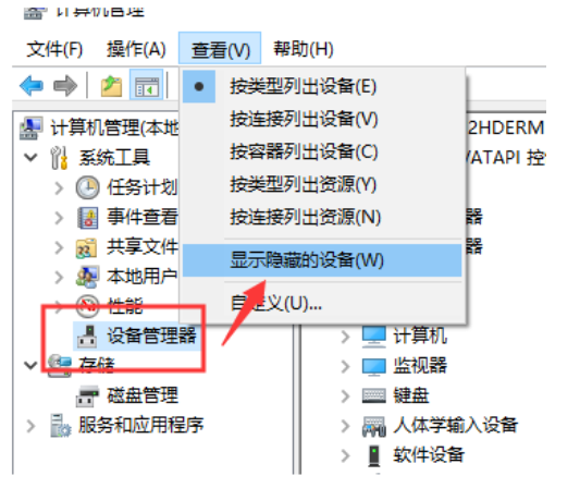 2、點(diǎn)擊左側(cè)的設(shè)備管理器,然后點(diǎn)擊上方的查看選擇,點(diǎn)擊顯示隱藏的設(shè)備。