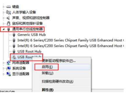 3、下方如果顯示U盤選項(xiàng),右擊選擇啟用,也可以嘗試更新驅(qū)動(dòng)程序軟件。