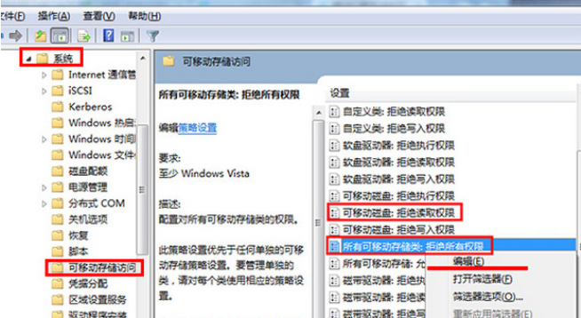 7、在打開的本地組策略編輯器窗口,依次點擊“計算機配置—管理模塊—系統(tǒng)—可移動存儲訪問”,并在右側(cè)中找到“可移動磁盤:拒絕讀取權(quán)限”和“所有可移動磁盤:拒絕讀取權(quán)限”單擊右鍵點擊“編輯”選項,如下圖所示: