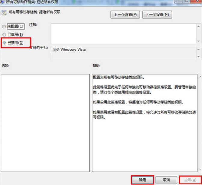 8、接著在彈出的窗口中點擊“已禁用”按鈕,再點擊“應(yīng)用—確定”按鈕。