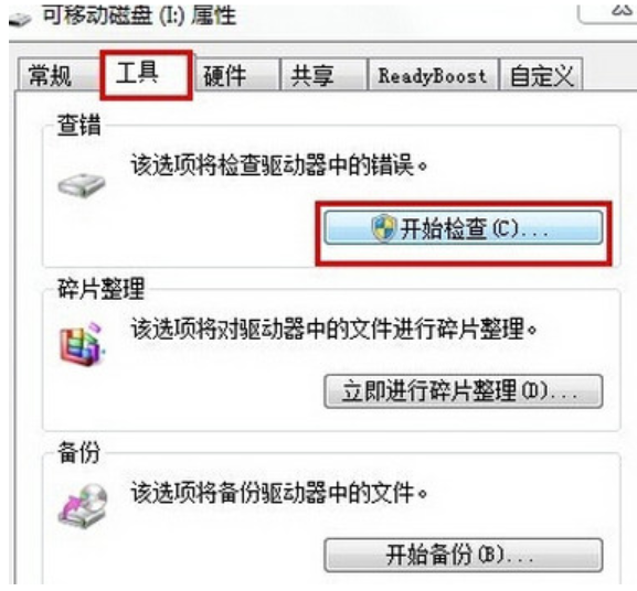 2、在彈出的屬性窗口中點擊“工具”選項卡,再點擊“開始檢查”按鈕,如下圖所示: