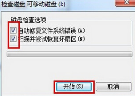 3、接著勾選“自動修復(fù)文件系統(tǒng)錯誤”和“掃描并嘗試恢復(fù)壞扇區(qū)”并點擊“開始”按鈕,如下圖所示: