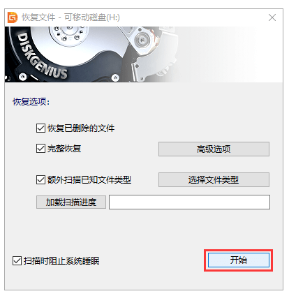 4、在彈出的恢復(fù)文件窗口上點(diǎn)擊"開始"按鈕,隨后進(jìn)入掃描階段。