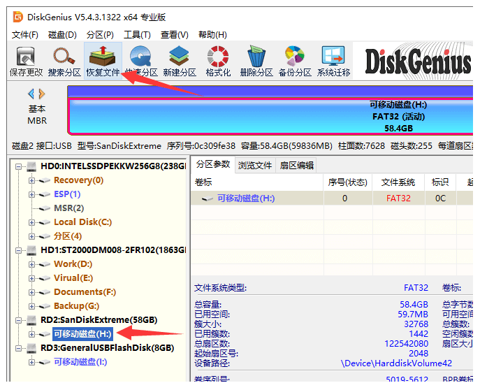 3、在DiskGenius軟件中選中提示格式化的U盤,然后點(diǎn)擊上方的"恢復(fù)文件"按鈕。