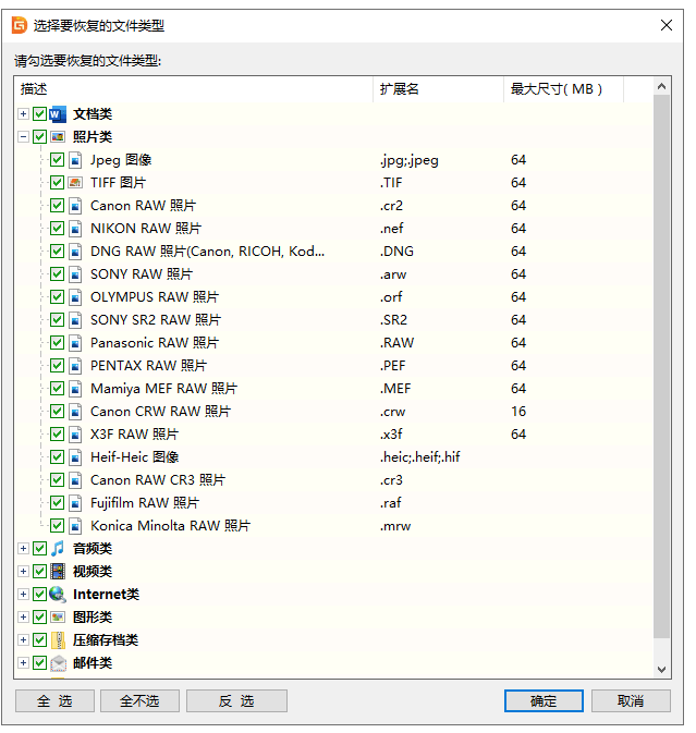 5、若點(diǎn)擊"選擇文件類型"按鈕,會(huì)彈出如下窗口。在這里可以指定深度掃描時(shí)的文件類型。