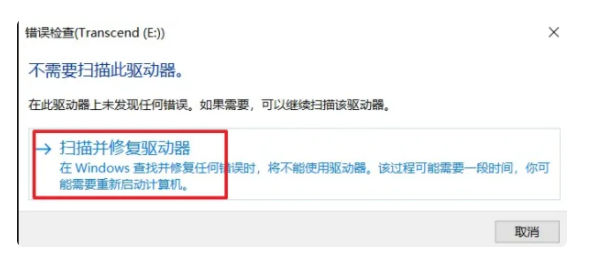 3、系統(tǒng)檢查完畢后,彈出“錯(cuò)誤檢查”對(duì)話框,點(diǎn)擊“掃描并修復(fù)驅(qū)動(dòng)器”。