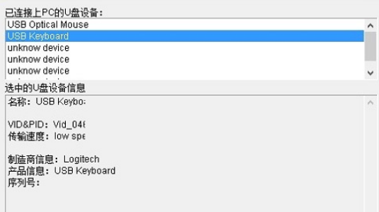2、u盤檢測(cè)器可以對(duì)不同類型的的U盤檢測(cè)例如:USB Optical Mouse,USB Keyboard,unknow device,unknow device,unknow device。
