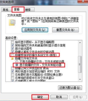 3,然后單擊文件夾選項(xiàng)窗口中的“視圖”部分,并在高級(jí)設(shè)置中隱藏受保護(hù)的操作系統(tǒng)文件(推薦),然后單擊“選擇”顯示隱藏文件“,”文件夾“和”驅(qū)動(dòng)器“。單擊“確定”。