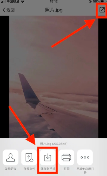 7、打開照片后,點(diǎn)擊右上角的【分享】,彈出列表點(diǎn)擊【保存到手機(jī)】即可。