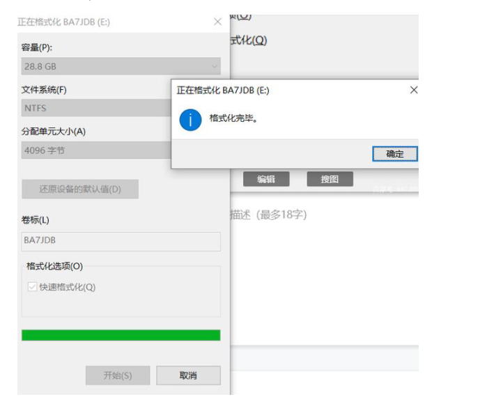3、打開(kāi)格式化BA7JDB(E:)對(duì)話框 ,在格式化選項(xiàng)下的快速格式化(Q)前打上勾。點(diǎn)擊確定,等待格式化U盤(pán)。