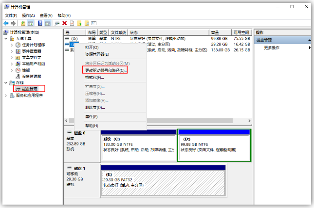 1、進入到「計算機管理」界面,在右側「存儲」-「磁盤管理」,找到「可移動磁盤」,并擊選擇「更改驅動器號和路徑」。