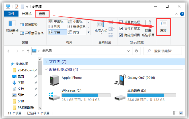 1、U盤在電腦上被隱藏的話也會打不開,將U盤插入電腦后,打開「此電腦」,點擊「查看」-「選項」。