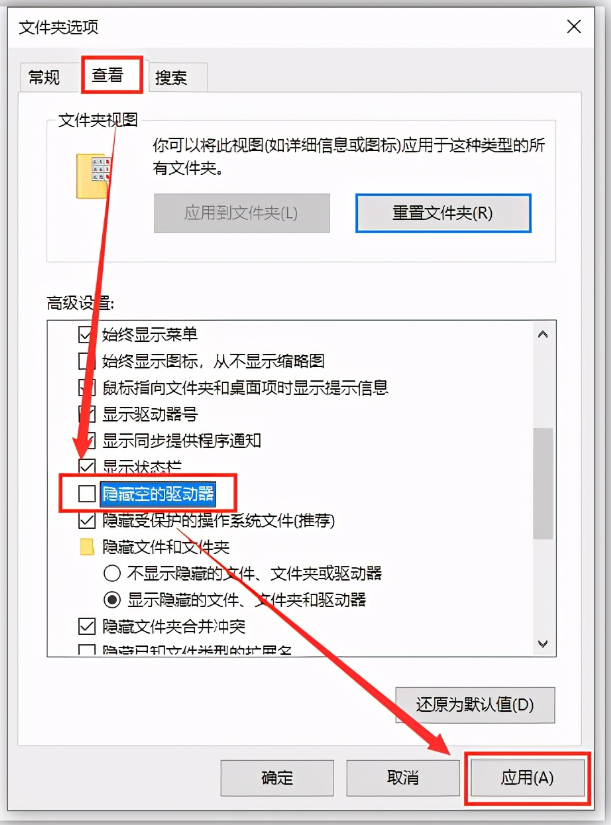 2、在文件夾選項界面,點擊「查看」,取消勾選「隱藏空的驅動器」這個選項,點擊「應用」即可。