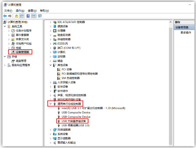 1、如果電腦沒反應,但U盤驅動程序已經自動加載上了,可能出現(xiàn)了某些故障,所以顯示不出來,這個時候先將這個USB設備卸載。依舊是先進入到「計算機管理」界面,點擊「設備管理器」,找到「通用串行總線控制器」,雙擊「USB大容量存儲設備」。