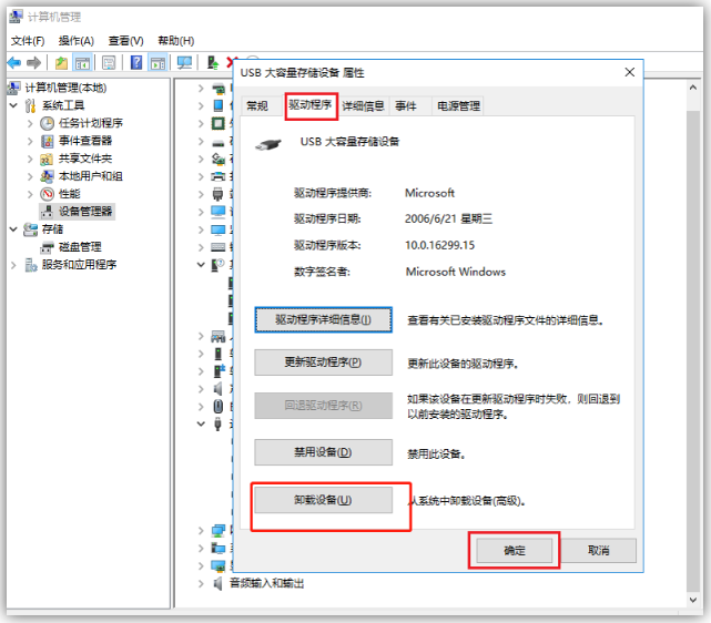 2、在彈出的窗口中點擊「驅動程序」-「卸載設備」-「確定」,卸載完成之后將U盤重新插入電腦,系統(tǒng)會自動加載U盤驅動,最后檢查一下U盤是否被讀取。