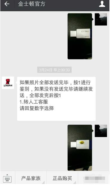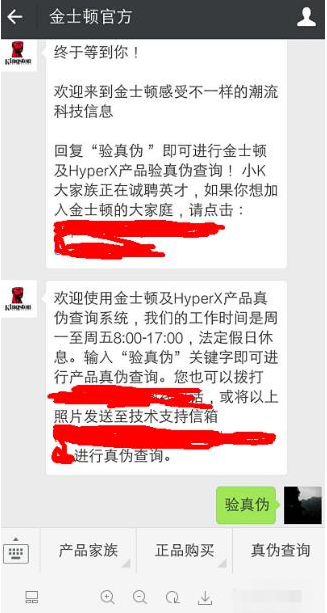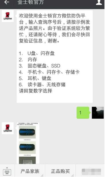 4、關(guān)注成功,會(huì)接收到金士頓官方消息,根據(jù)提示,輸入“驗(yàn)真?zhèn)巍?