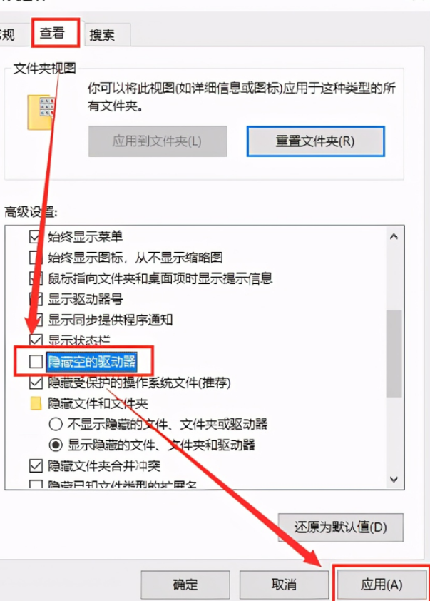 2.在文件夾選項(xiàng)界面,我們點(diǎn)擊「查看」,把隱藏空的驅(qū)動(dòng)器這一項(xiàng)取消勾選,然后點(diǎn)擊「應(yīng)用」,這樣就能顯示出隱藏的u盤(pán)盤(pán)符。