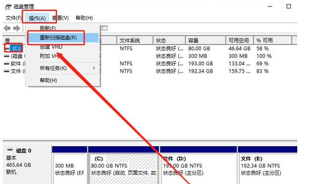 2、接著從C盤開始,逐一選中,鼠標(biāo)點(diǎn)擊工具欄的【操作(A)】,選擇【重新掃描磁盤(R)】進(jìn)行修復(fù)就可以啦。