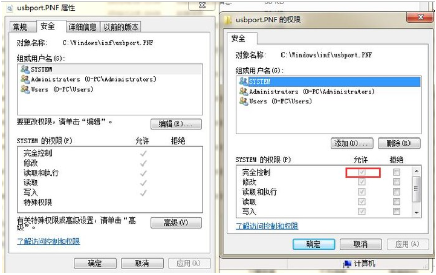 4、鼠標(biāo)右鍵點(diǎn)擊usbstor.pnf文件,在彈出菜單中選擇【屬性】,切換到【安全】標(biāo)簽頁,在【組或用戶名】框中選中當(dāng)前用戶名,接著點(diǎn)擊編輯,把用戶權(quán)限【完全控制】的勾去掉,點(diǎn)擊確定即可;