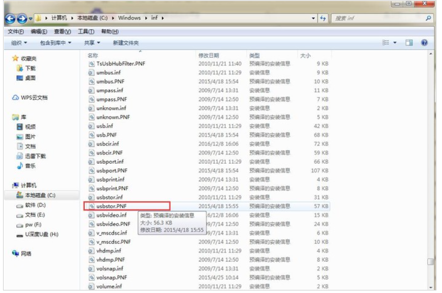 3、打開windows資源管理器中,進(jìn)入到系統(tǒng)盤:\windows\inf目錄,找到名為usbstor.pnf文件;