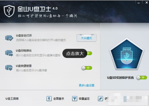 金山U盤衛(wèi)士是一款鑒定U盤真?zhèn)魏蜏y試U盤速度的小工具,提取于金山衛(wèi)士4.7最新版本,純綠色版,即下即用,能夠幫助用戶一鍵精準測試出U盤的真?zhèn)我约癠盤的讀寫速度,讓用戶能夠掌握自己的U盤性能優(yōu)劣,判斷出U盤的好壞。