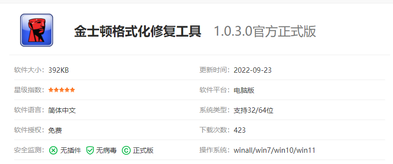 1、金士頓專用格式化工具。kingston format utility可以將u盤(pán)進(jìn)行格式化,對(duì)于無(wú)法讀取的金士頓優(yōu)盤(pán)進(jìn)行讀取,對(duì)于損壞的扇葉進(jìn)行修復(fù)。操作方法也比較簡(jiǎn)單,是一款相當(dāng)不錯(cuò)的U盤(pán)修復(fù)工具。