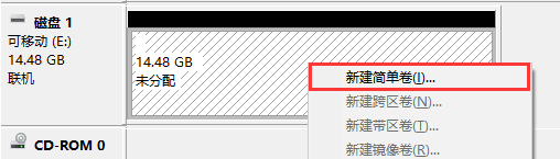8、然后選中未分配的磁盤→新建簡單卷。