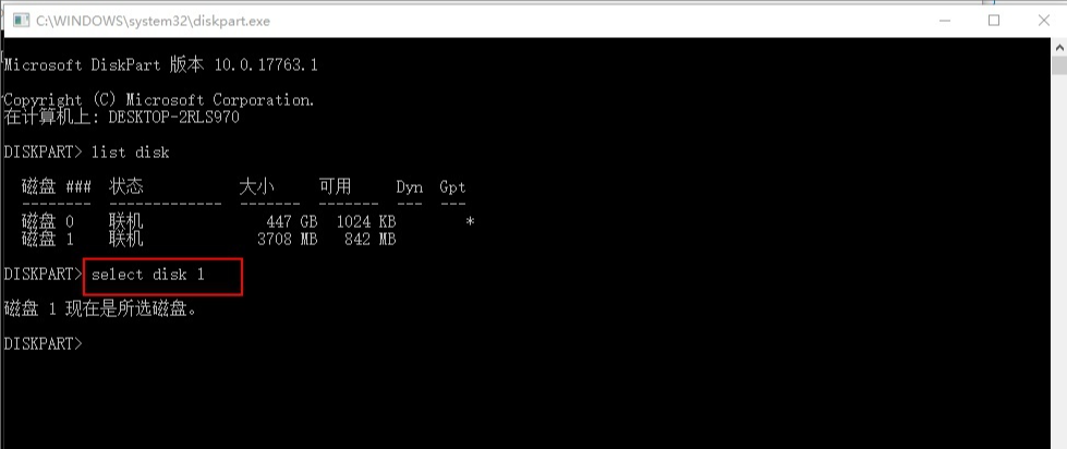 4、再輸入命令select disk 1(大家注意空格),意思就是選中磁盤1,也就是我的U盤,按回車。