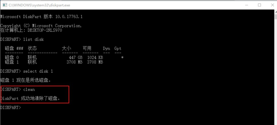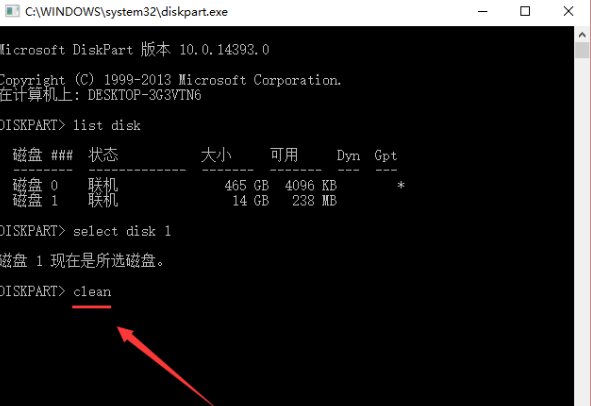5、然后輸入命令“clean”清除磁盤,也就是說清除U盤本身。